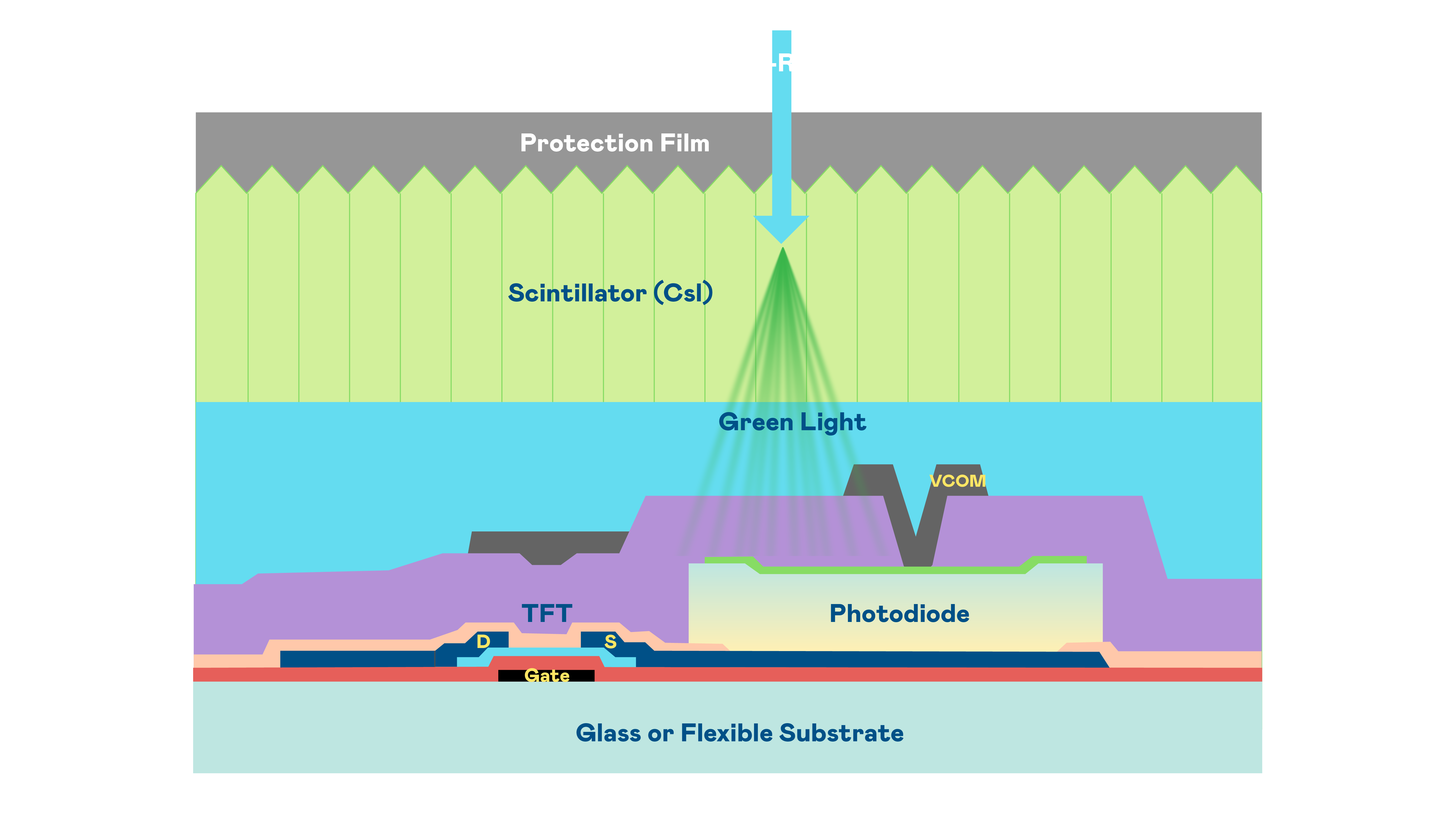 365英国上市公司的X光影像感測陣列使用薄膜電晶體 (TFT) 作為每個像素的讀取開關,搭配光電二極體(Photodiode)的光電轉換元件,用以感測X光影像訊號。
